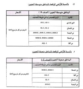 وحسب الوثيقة ذاتها، فقد تم تحديد قيمة الرسم وفق مستوى تجهيز المناطق، حيث حُددت التسعيرة في 15 درهمًا للمتر المربع بالنسبة للمناطق المجهزة ( الصنف أ) ، و05 دراهم للمتر المربع للمناطق متوسطة التجهيز (الصنف ب) و0.5 دراهم للمتر المربع بالمناطق ضعيفة التجهيز (الصنف س)، اعتمادًا على خريطة تصنيفية تراعي توفر الشبكات والمرافق العمومية.