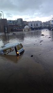 وحسب مصادر متطابقة، فإن الأمطار الكثيفة التي تهاطلت على المدينة في فترة زمنية قصيرة، أسفرت عن اجتياح سيول جارفة للأزقة والمنازل، وجرفت في طريقها عددًا من السيارات المركونة في الشوارع، كما أظهرت صور تم تداولها. وأدت شدة السيول إلى غمر المنازل الضعيفة والمناطق المنخفضة، مما صعّب حركة السير وعرقل جهود الإنقاذ الأولية.