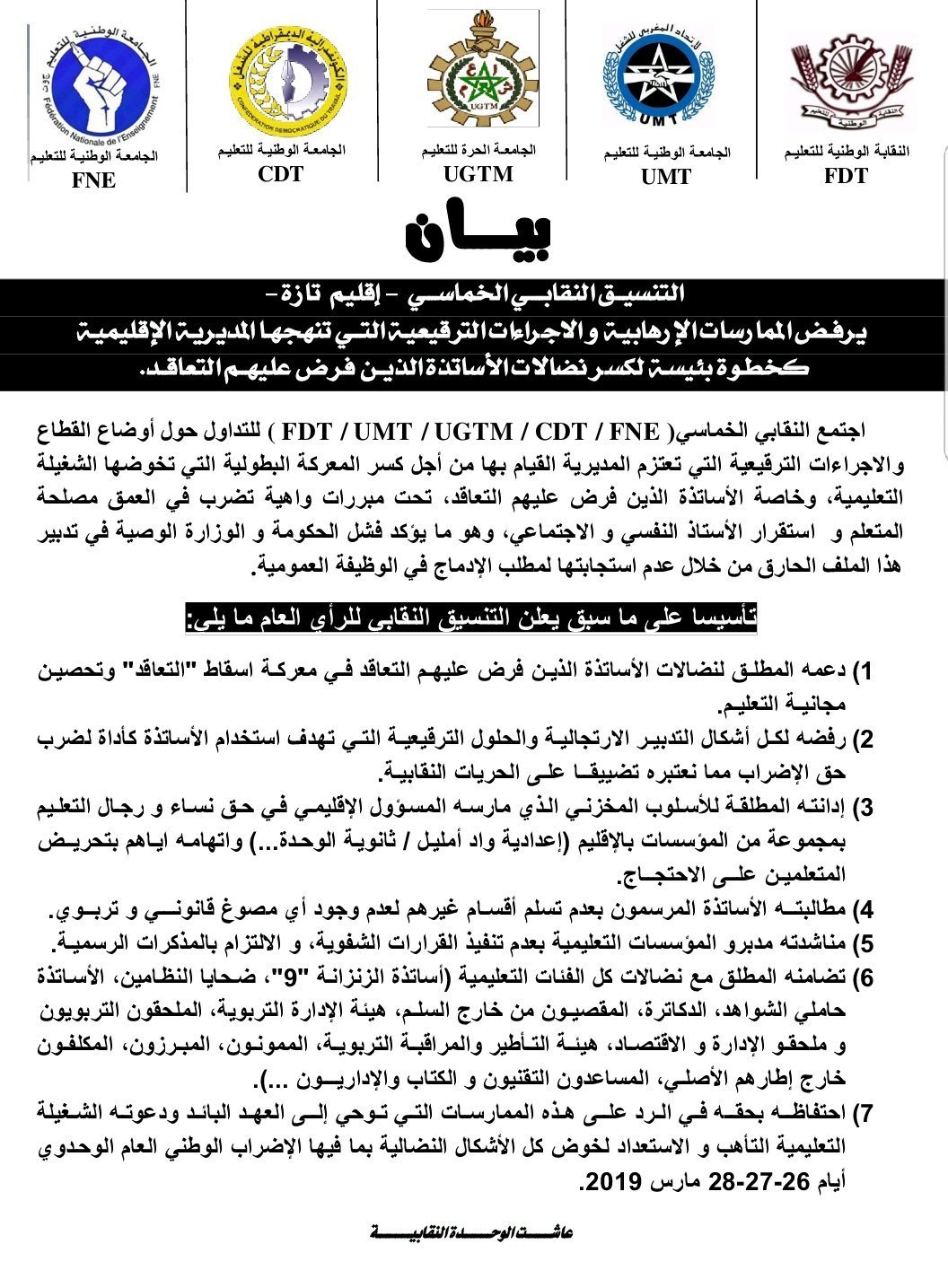 طالب التنسيق النقابي بتازة المكون من النقابة الوطنية للتعليم ،الجامعة الوطنية للتعليم ، الجامعة الحرة للتعليم الاتحاد العام للشغالين بالمغرب، النقابة الوطنية للتعليم الفدرالية الديموقراطية للشغل ، الجامعة الوطنية للتعليم ، المدير الإقليمي لوزارة التربية الوطنية بتازة بوقف الاستفزازات و الإجراءات الترقيعية والأسلوب المخزني التي تنهجها إدارته.